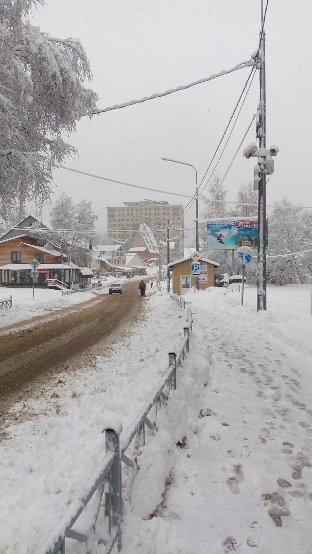Снег идет, на трассах видимости нет. В поселке дождь. Все работает.