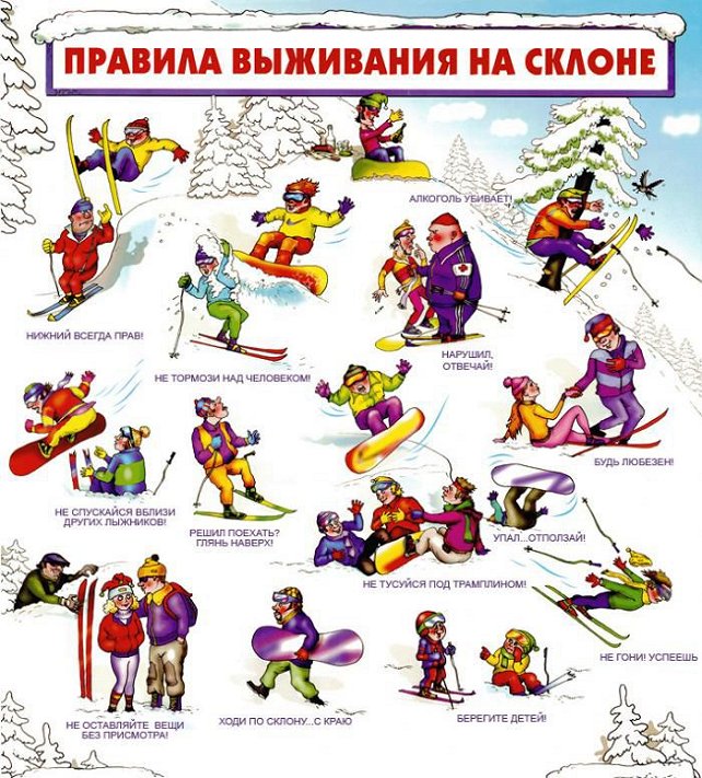 образом, чтобы не подвергать опасности и не наносить ущерб окружающим. Комментарий: Лыжник или сноубордист ответственен не только за свое поведение, но и за неисправность своего снаряжения. Это так же относится к использованию новинок — недавно разработанного снаряжения. 2. Контроль скорости и траектории Лыжник или сноубордист должен контролировать свое движение по трассе. Необходимо выбирать скорость и стиль катания соответственно своим способностям, особенностям рельефа, погодным условиям и плотности траффика на горе. Комментарий: Столкновения часто случаются из-за того, что лыжники или сноубордисты едут слишком быстро, не следя за окружающими, не замечая их. Лыжник или сноубордист должен быть способен останавливаться, поворачивать и двигаться внутри границ своего поля зрения. В переполненной людьми области склона или в месте, где видимость ограничена, лыжник должен ехать медленно, особенно на границе крутого склона, в нижней части трассы и в области около подъемников. 3. Выбор направления Лыжник или сноубордист, едущий сверху, должен выбирать траекторию своего движения таким образом, чтобы не создавать опасности лыжника или сноубордиста, находящимся впереди. Комментарий: Горные лыжи и сноуборд это свободный спорт, где каждый может ехать где и как ему нравится, при условии, что он соблюдает настоящие правила и соизмеряет свое катание со своими возможностями и условиями на склоне. Лыжник или сноубордист, едущий впереди, имеет приоритет. Лыжник или сноубордист, едущий позади другого в том же направлении, должен сохранять достаточную дистанцию между ним и другим лыжником или сноубордистом для того, чтобы едущий впереди лыжник мог выполнять все свои движения свободно. 4. Обгон Лыжник или сноубордист может совершить обгон другого лыжника или сноубордиста сверху, снизу, справа или слева, при условии, что он оставляет достаточно свободного места обгоняемому лыжнику или сноубордисту для любых намеренных и непреднамеренных движений. Комментарий: Лыжник или сноубордист, обгоняющий другого лыжника, полностью ответственен за то, что выполняемый им маневр не создаст никаких сложностей для лыжника, которого он обгоняет. Эта ответственность сохраняется за ним до тех пор, пока обгон не будет выполнен. Это правило распространяется и на случай обгона (объезда) неподвижного лыжника. 5. Выход на склон, начало движения, движение вверх Лыжник или сноубордист, выходящий на размеченную трассу, начин