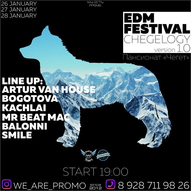 музыки на Эльбрусе! Технический запуск очередного проекта от команды @we_are_promo "CHEGELOGY"(ЧЕГЕЛОГИЯ). Представляет из себя серию вечеринок с диджеями разных музыкальных направлений. На территории знакового для эльбрусского района пансионата "Чегет", который долгие годы является символом горнолыжного отдыха в России. Проект включает дневные промоакции с участием музыкантов и спортсменов горного фристайла на поляне одноименного пансионата. Вечером, переоборудованный холл пансионата будет действовать как полноценная клубная площадка для гостей и жителей республики. Новый день-новые артисты. Проект направлен на развитиее инфраструктуры развлечений и сферы обслуживания в Приэльбрусье, а так же создание благоприятного информационного фона для тех, кто еще не был в нашей республики. Вся подробная информация по номеру 8(928) 711-98-26 либо в Инстаграмм @we_are_promo