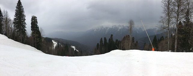 Горки-город 21.03. Открыты только две короткие трассы на самых вершинах, укутанных облаком. В результате ни видов, ни длинных спусков. Скука. Если приезжать, то после обеда - скипасс подешевле, погода получше, людей к концу мало.