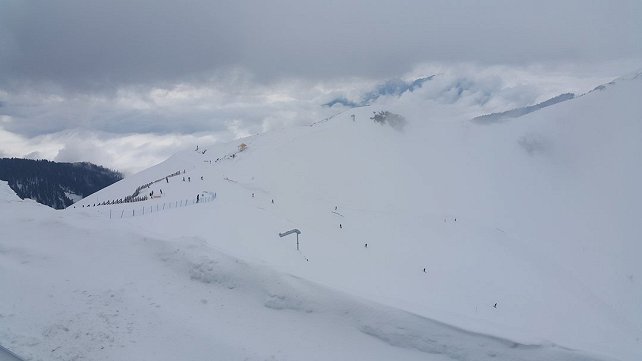 На Розе-пик 15 апреля был великолепный снег. Отдыхающих мало, склоны сухие